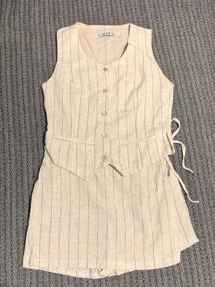 Şort etekli ve yelekli keten takım. Ürün hiç kullanılmadı.