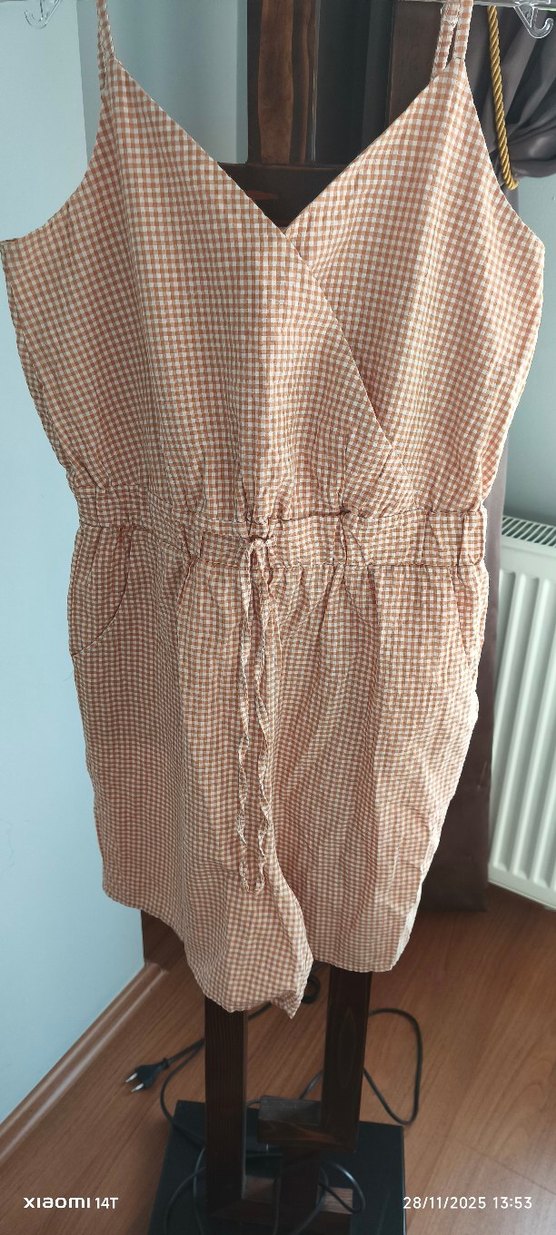 Bej keten kumaştan, pilili, V yakalı, askılı kollu, midi uzunlukta bol kesim hamile tulumu. Günlük kullanım için uygundur. rengi çok tatlı bir sorunu yok temizdir
