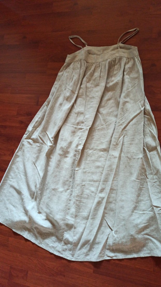 Bej keten kumaştan, askılı ve straplez yaka detaylı, bol kesim ve drapeli uzun bohem elbise.
