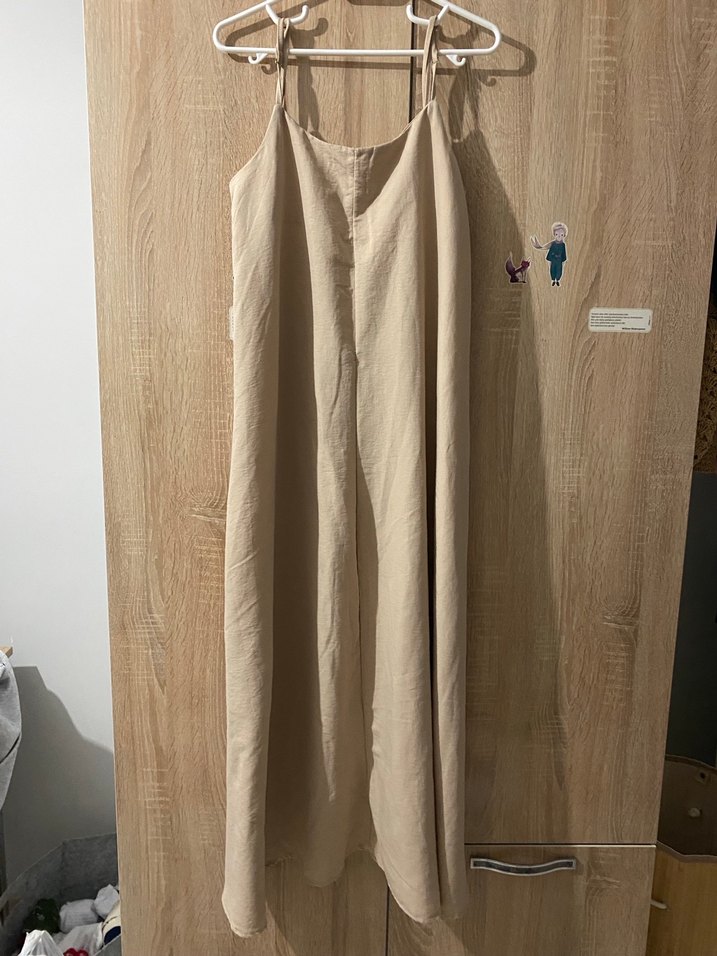 Bej renkte keten, askılı, uzun ve bol kesim elbise. Straplez yaka ve drapeli tarzıyla sade ve bohem bir görünüm sunar.