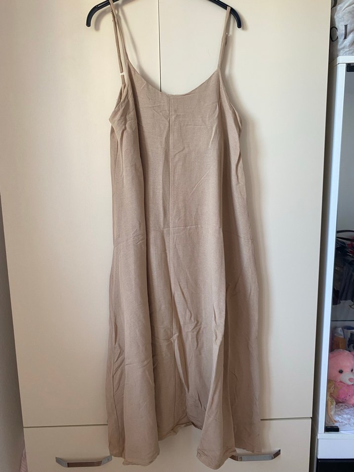 Bej keten uzun elbise, askılı ve salaş kesimlidir. Drapeli tasarımı ve askısız yakasıyla minimalist bohem tarz sunar.