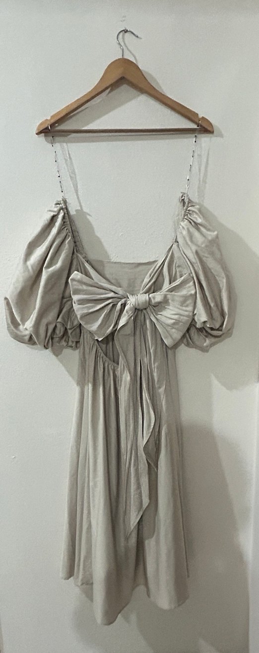 Bej keten uzun elbise, kayık yaka ve ince askılıdır. Bol kesim, drapeli ve büyük fiyonk detayıyla düğünler için uygundur.