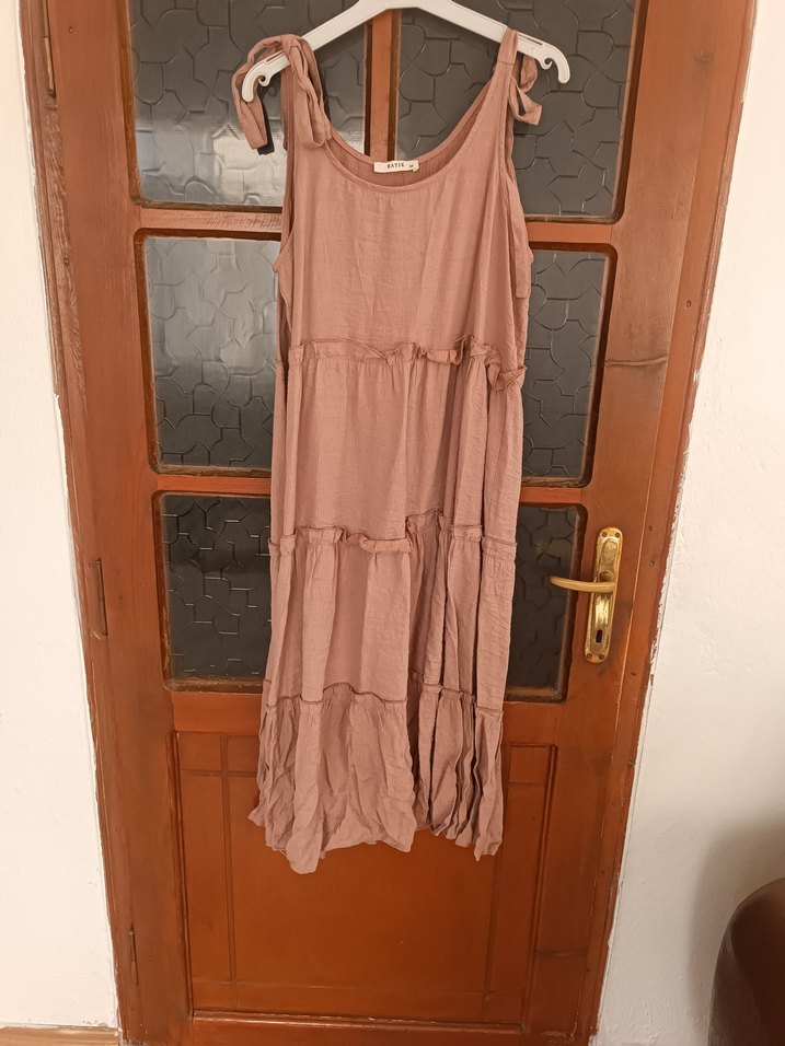 Bej keten kumaştan, salaş kesim ve fırfırlı detaylara sahip kolsuz bohem elbise, günlük kullanıma uygundur.