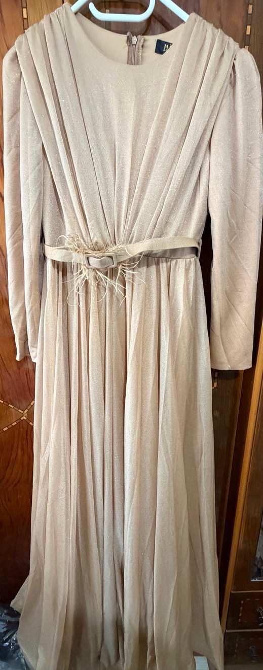 Bej Keten Uzun Drapeli Kadın Elbise