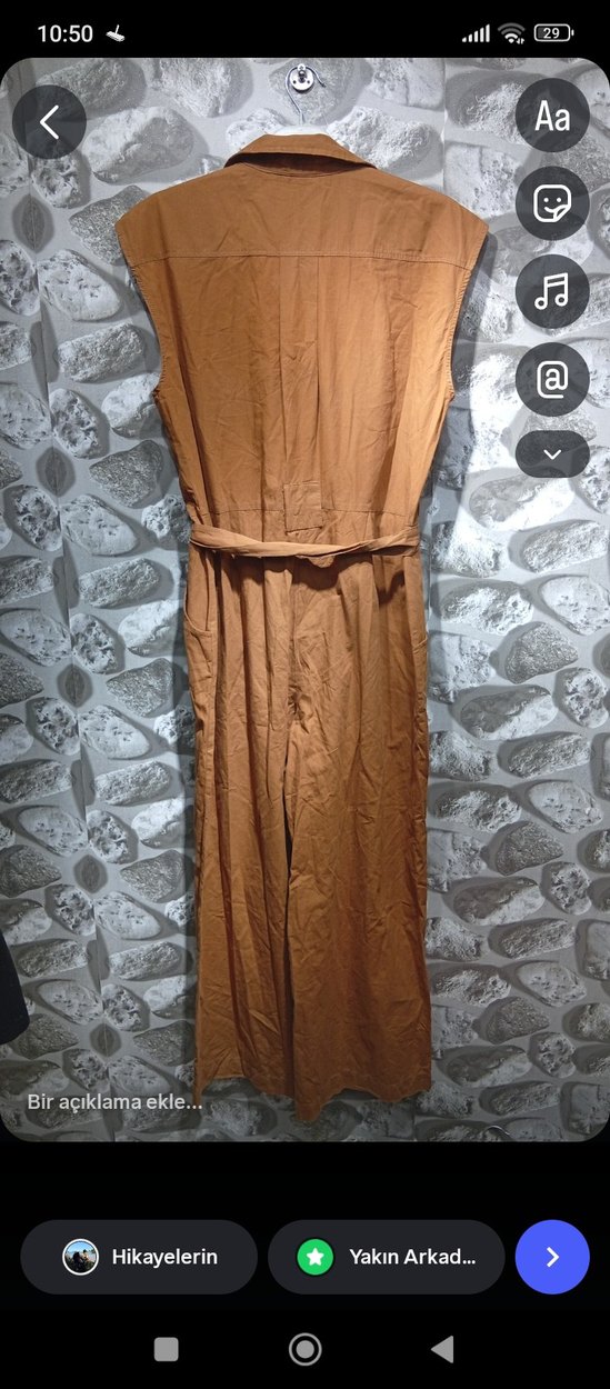 Bej renkte keten kumaştan, yüksek yakalı, drapeli ve kolsuz uzun kadın tulumu. Bol kesimi ve parlak dokusuyla vintage bohem tarzını yansıtır.
