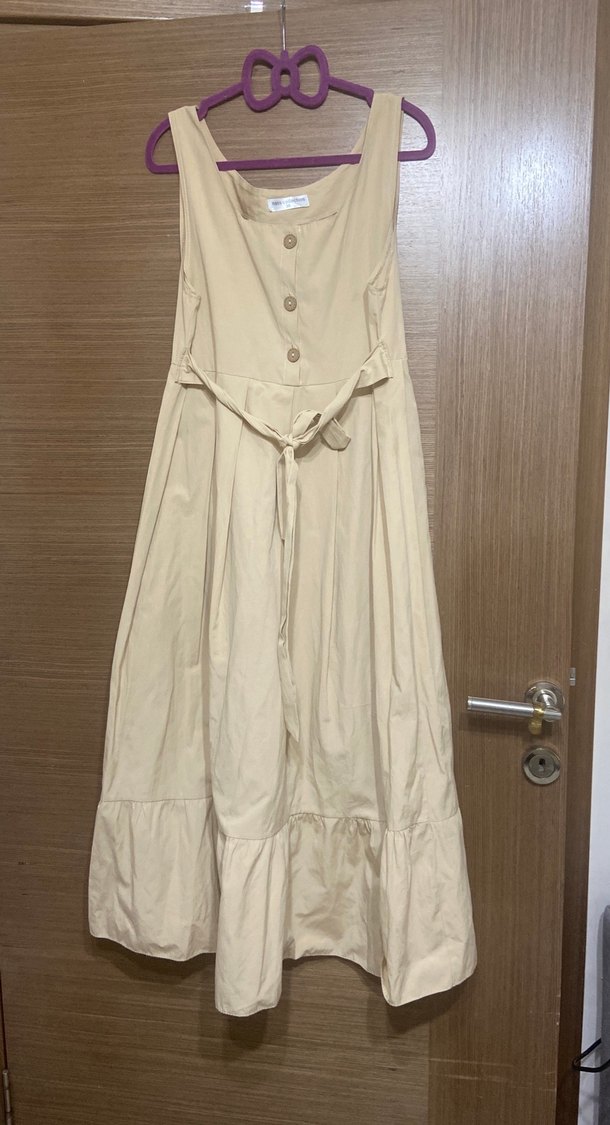 Bej keten kumaştan, düğmeli ve askısız uzun elbise. Belden bağlamalı, bol kesim rahat kullanıma uygun.