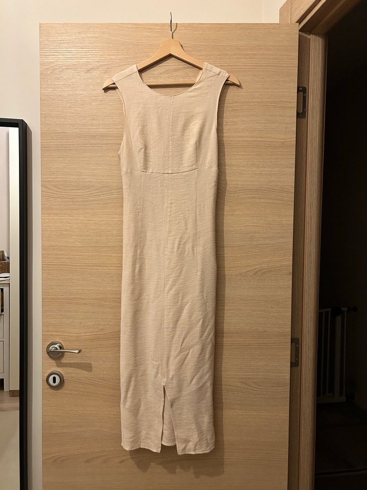 Keten kumaştan, bej renkte, kolsuz, tek renk uzun elbise.