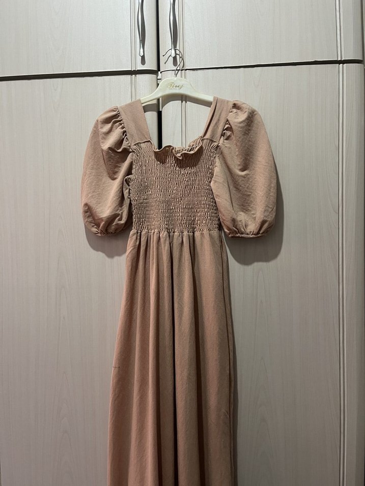 Keten kumaştan yapılmış, bol kesim, uzun bej elbise. Kabarcık kollu ve fırfırlı yaka detayına sahip, yumuşak ve doğal dokulu.