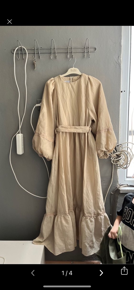 Bej keten uzun elbise, yüksek yakalı ve bol kesimdir. Kemeri var kendinden astarlı