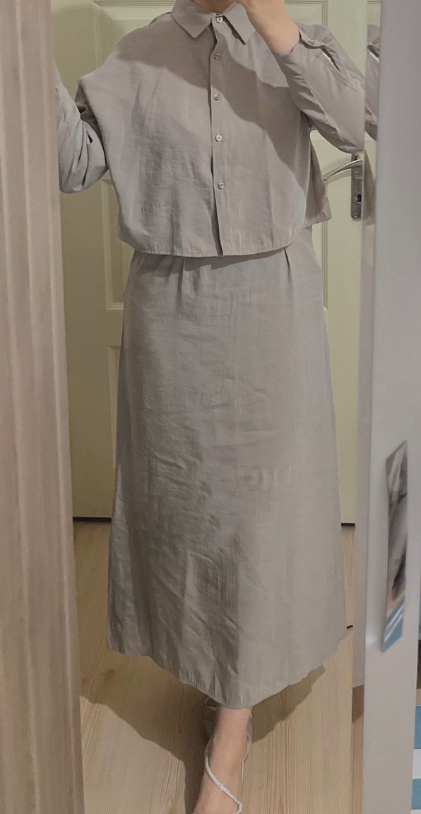 Bej renkli, keten kumaştan uzun elbise, askılı,gömlekli ve rahat kesimdir. Düz ve desen içermeyen tasarımıyla minimalist bir stil sunar.