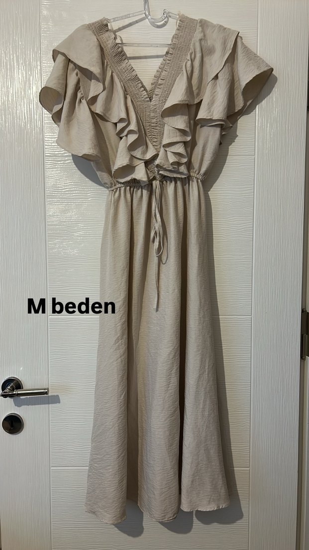 Bej keten kumaştan, V yaka ve fırfır detaylı uzun elbise. Salaş kesimi ve nakışlı deseniyle bohem Paris tarzını yansıtır. Kolsuz, günlük kullanıma uygun. M beden.