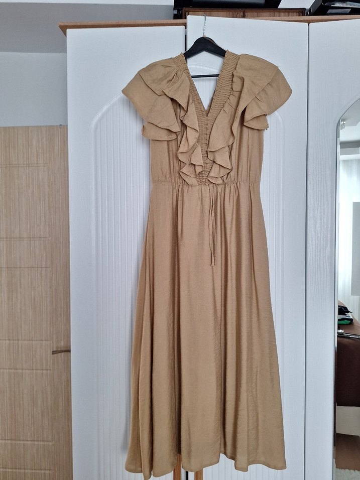 Bej keten kumaştan yapılmış, V yakalı, fırfır detaylı, bol kesim uzun elbise. Vintage bohem tarzını yansıtır, günlük kullanım için uygundur. sıfır üründür hiç giyilmedi