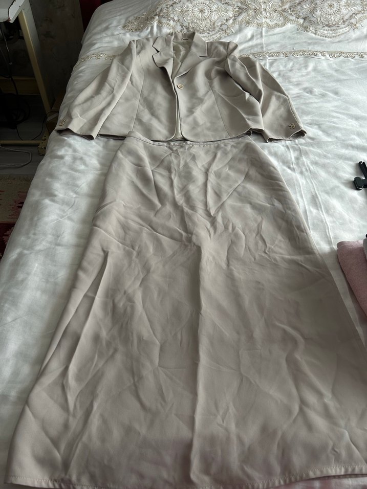 Bej renkte, keten kumaştan uzun kadın takımı, drapeli ve yakalı, askılı kollu, klasik ve rahat kesimle ofis şıklığı sunar. ( Yeni yıkandı O yüzden kırışık kalitesi Mükemmel )