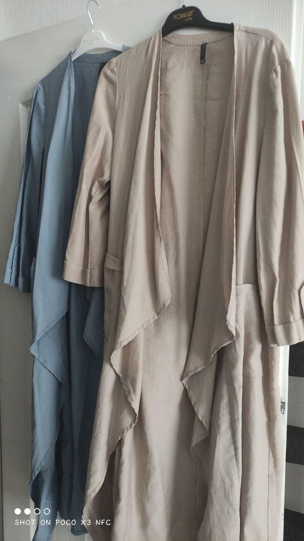 Bej keten kumaştan uzun trençkot, drapeli ve kesik yakalıdır. Uzun kollu ve bol kesimdir, günlük kullanıma uygundur.