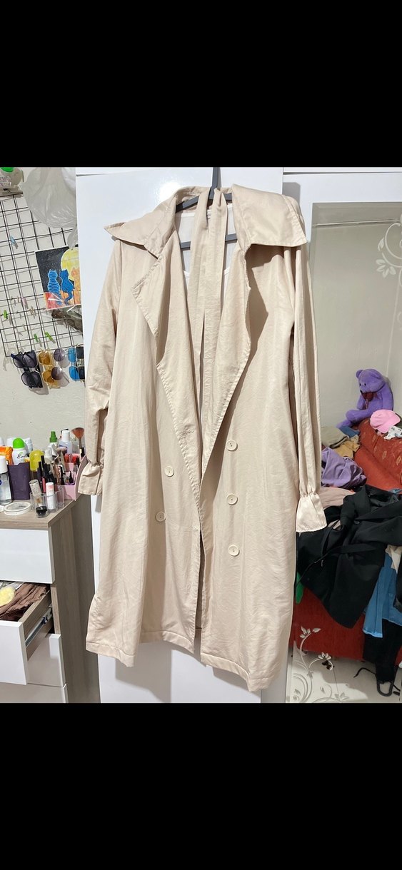Bej keten midi trençkot, bol kesim, uzun kollu ve düğmeli. Notlu yaka ve desen içermeyen sade tasarım, Paris sokak modasını yansıtıyor.