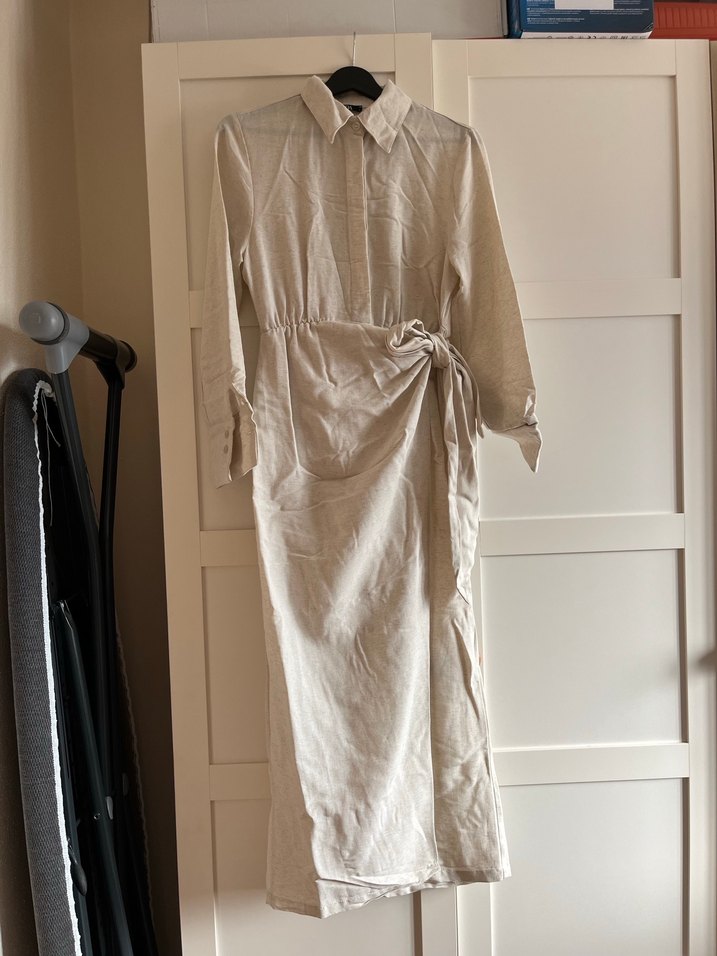 Bej keten uzun kollu elbise, yakalı ve dökümlü tasarıma sahip. Minimalist bohem tarzda, rahat kesimli günlük kullanıma uygun.