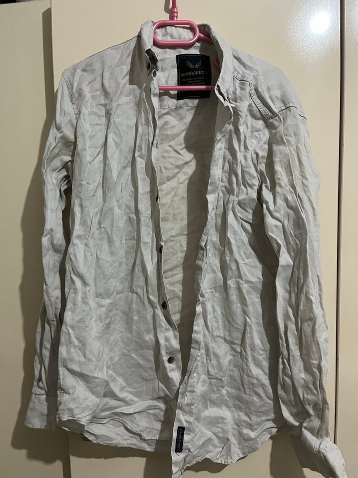 Erkekler için keten kumaştan üretilmiş, düğmeli, uzun kollu ve yakalı bej renkte bol kesim gömlek. Rahat sokak stili için uygundur. Keteb tüsüz tam yazşık