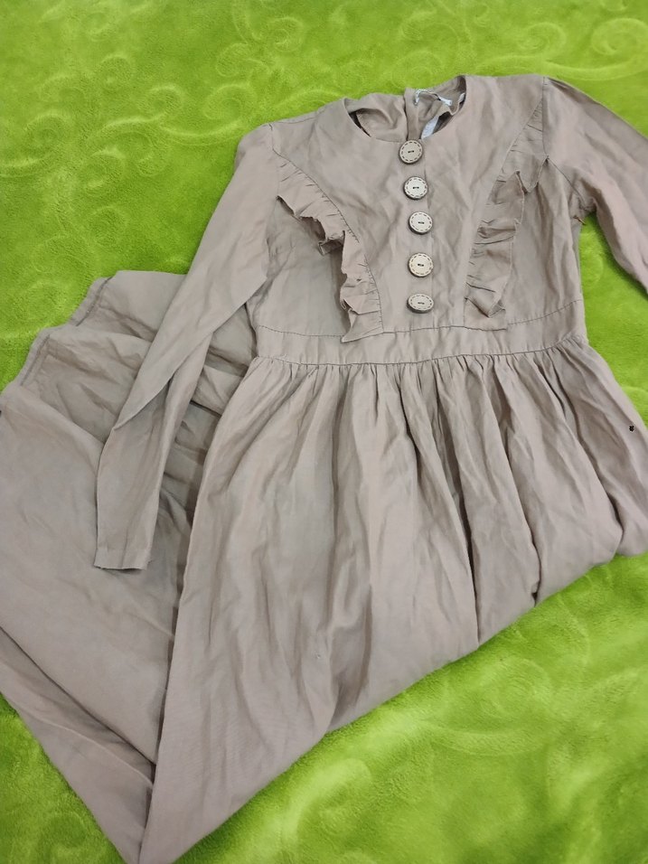 Bej Keten Uzun Kollu Fırfırlı Elbise