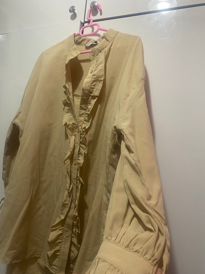 Bej keten kumaştan, yakalı ve fırfırlı detaylı uzun kollu gömlek. Salaş kesim ve uzun boy ile trend sokak stiline uygun.