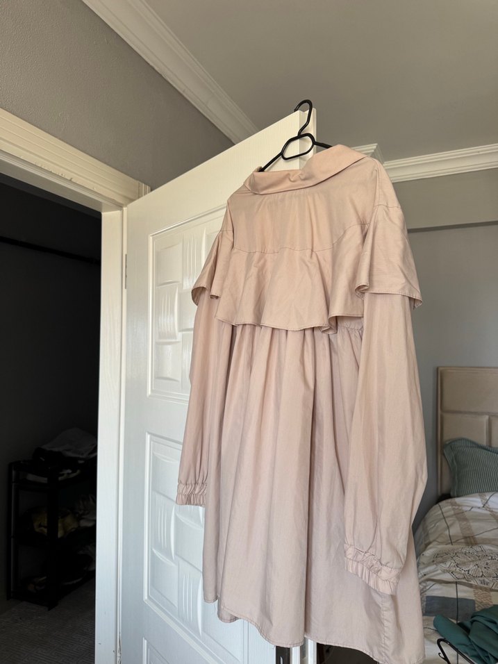 Bej keten kumaştan, bol kesim, uzun kollu ve yüksek yakalı tunik.Fırfır detayı ile sade ve şık bir tasarım sunar.