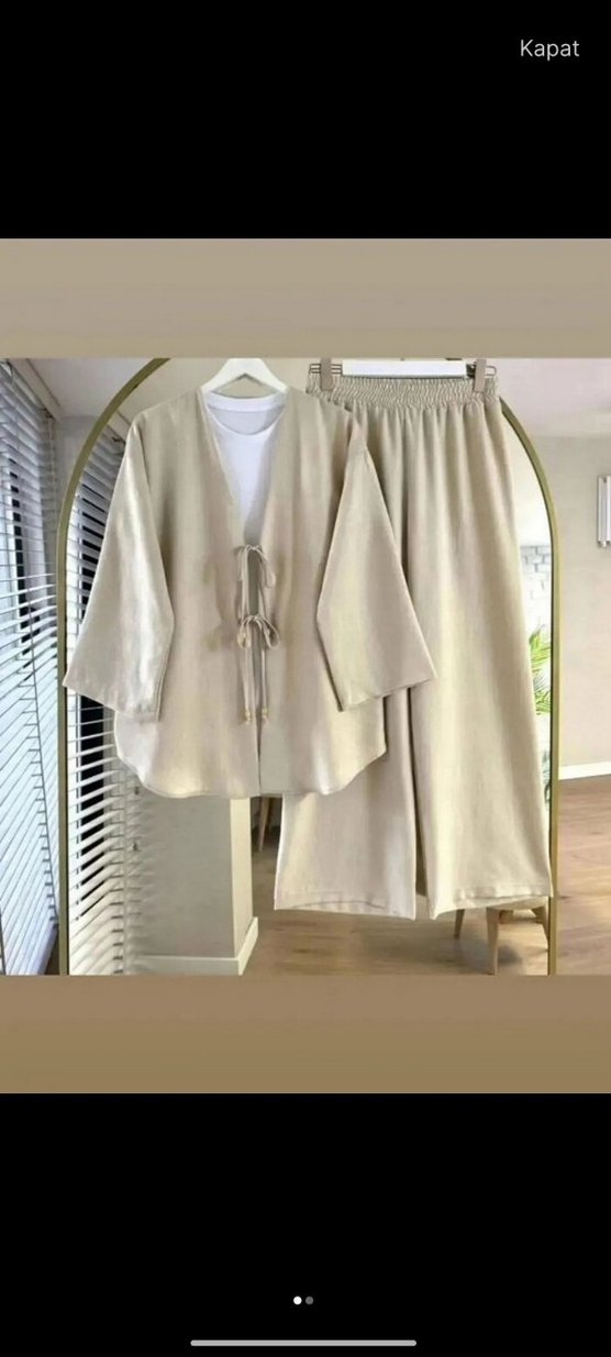 Bej keten kumaştan, uzun kollu, salaş kesim ve yakalı uzun kadın kimono. Minimalist normcore tarzında, günlük kullanım için rahat ve şık görünüyor.