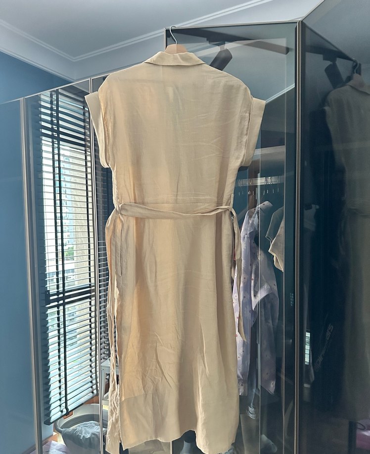 Bej keten kumaştan, salaş kesim ve V yaka olan, kolsuz uzun elbise, günlük kullanım için uygundur. Network yeni 1 kez giyildi