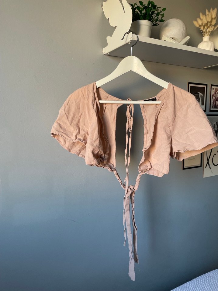 Bej keten kumaştan, V yakalı, kısa ve bol kesim, askılı kollu, fırfırlı detaylı bohem tarzı bluz. Önün ipi var bağlanabiliyor yuvarlak olan kısım sırt dekoltesi şık ve tatlı bir bluz