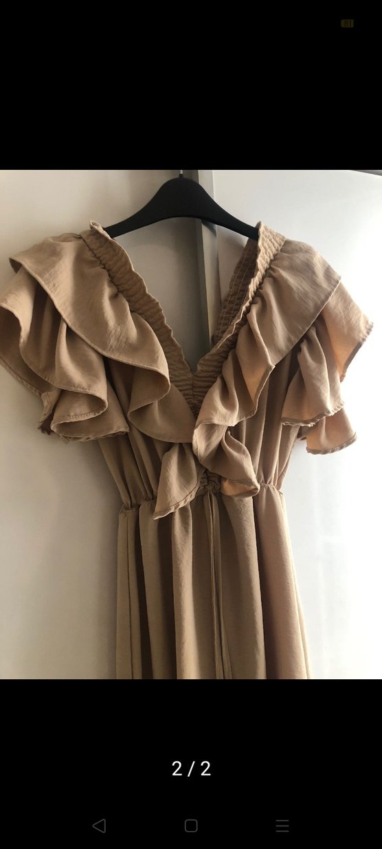 Bej keten uzun elbise, V yaka ve fırfır detaylıdır. Salaş kesimi ve kolsuz tasarımı ile bohem ve Paris tarzını yansıtır.