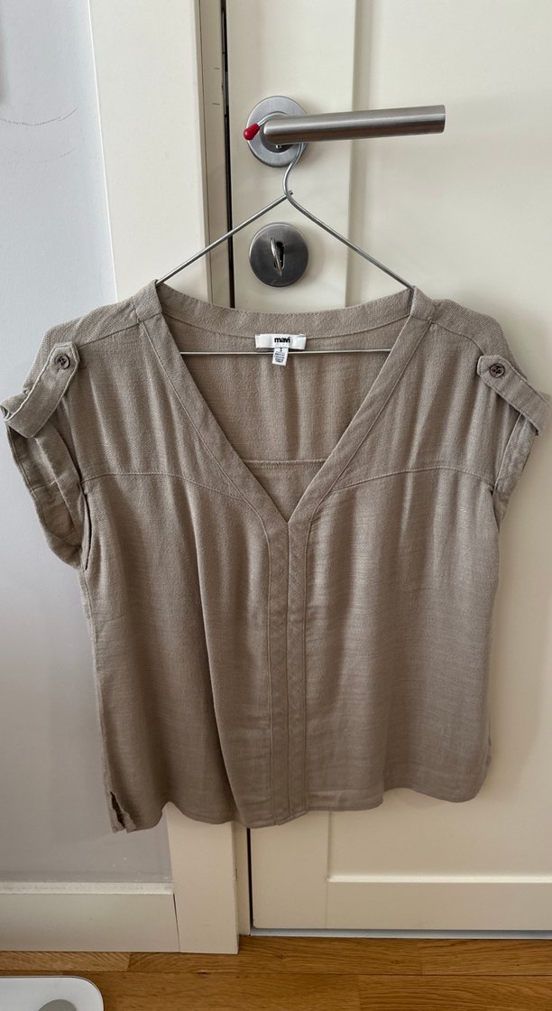 Keten kumaştan yapılmış, bej renkli, kısa kollu, V yaka ve düğmeli detaylara sahip bol kesim bluz. Minimalist tarzda, günlük kullanım için uygundur.