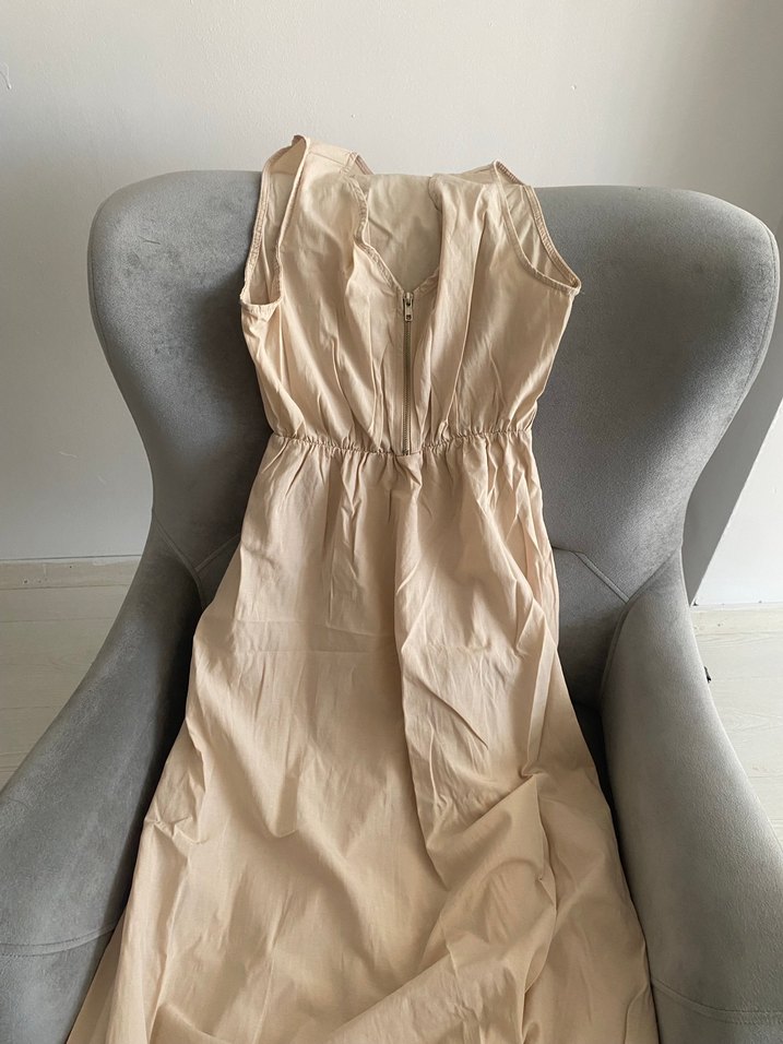 Bej renkte, keten kumaştan, V yakalı, kolsuz ve drapeli uzun, vücuda oturan elbisedir. Minimalist bohem tarzı sunar. Hiç kullanmadım