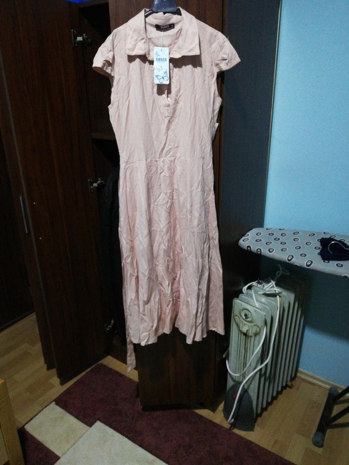 Bej keten kumaştan, V yaka, kolsuz, bol kesim uzun elbise. Dökümlü stilde, minimal ve günlük kullanıma uygun.