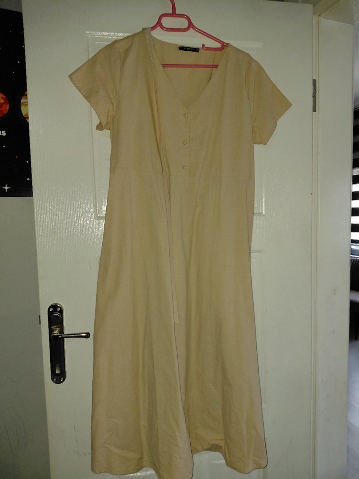 Bej renkli, keten kumaştan yapılmış, kısa kollu ve V yakalı uzun hamile elbisesi. bi kez giyilmedi