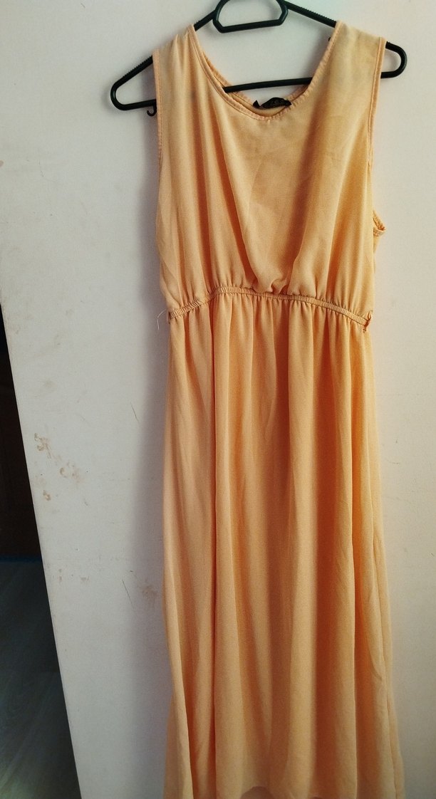 Bej keten uzun elbise, salaş kesim, kolsuz ve V yaka ile bohem stil için uygun, dökümlü tasarıma sahiptir.