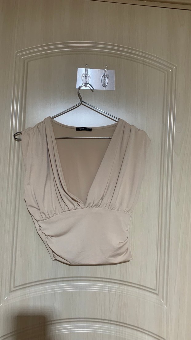 Bej Keten V Yakalı Drapeli Mini Bluz
