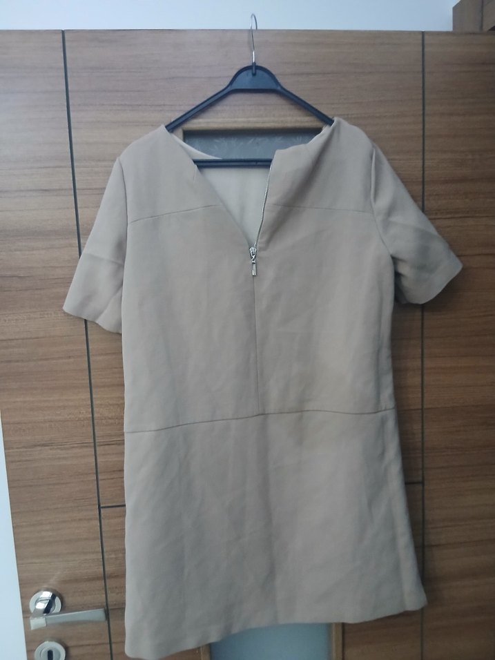 Bej keten kumaştan, V yakalı, kısa kollu, bol kesim midi uzunlukta hamile tunik. Fermuarlı ve minimal tasarımlı, günlük kullanıma uygun.
