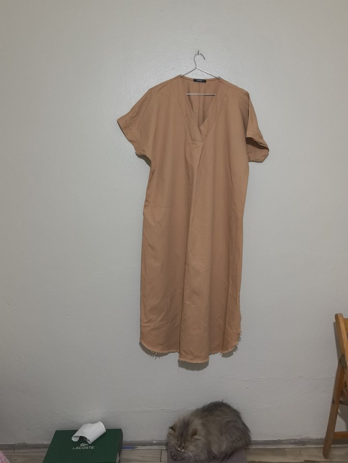 Bej keten kumaştan, kısa kollu, V yakalı ve rahat kesim uzun elbise. Minimalist ve zahmetsiz şıklık sunar.