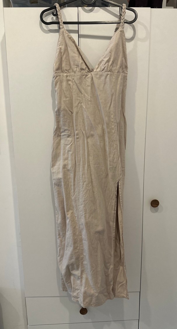 Bej Keten V Yakalı Uzun Elbise