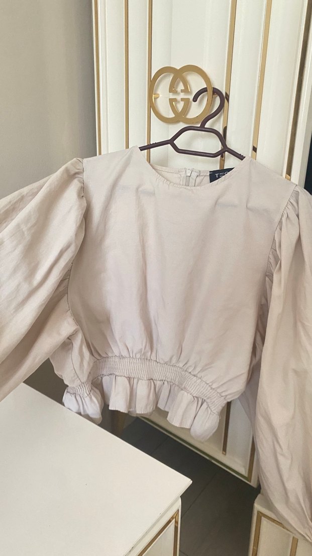 Bej keten kumaştan, uzun kollu, volan detaylı, yuvarlak yakalı, bol kesim kısa uzunlukta kadın bluz.