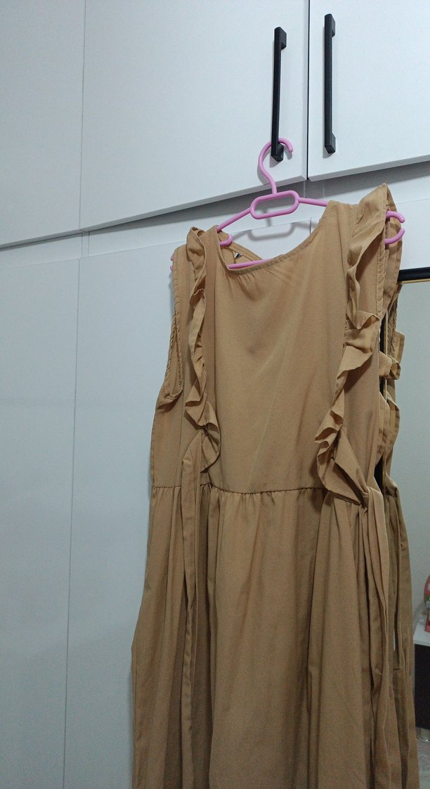 Bej renkte, keten kumaştan, salaş kesim ve volan detaylı, askısız uzun salopet elbisesi. Minimalist ve bohem tarzda, günlük kullanım için uygundur. hiç giymedim 36/38 beden ama 40/42 giyenede olur çünkü yandan bağlamalı bı salopet ve bol kesim.❤️