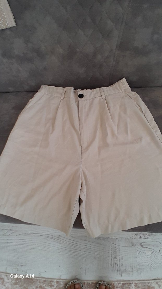 Yumuşak keten kumaştan yapılmış, bej renkli yüksek bel şort. Rahat kesimi ve desen içermeyen minimalist tarzıyla günlük kullanıma uygundur.