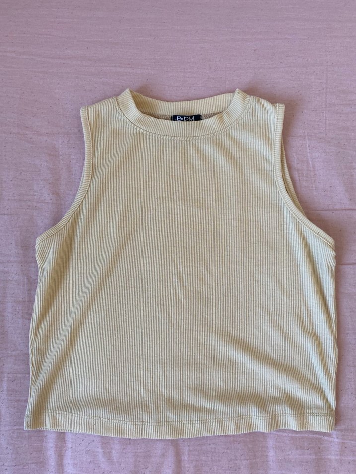 Yumuşak keten kumaştan yapılmış, yüksek yakalı ve kolsuz, pastel bej renkte minimal tasarımlı, günlük sokak stiline uygun basic atlet.