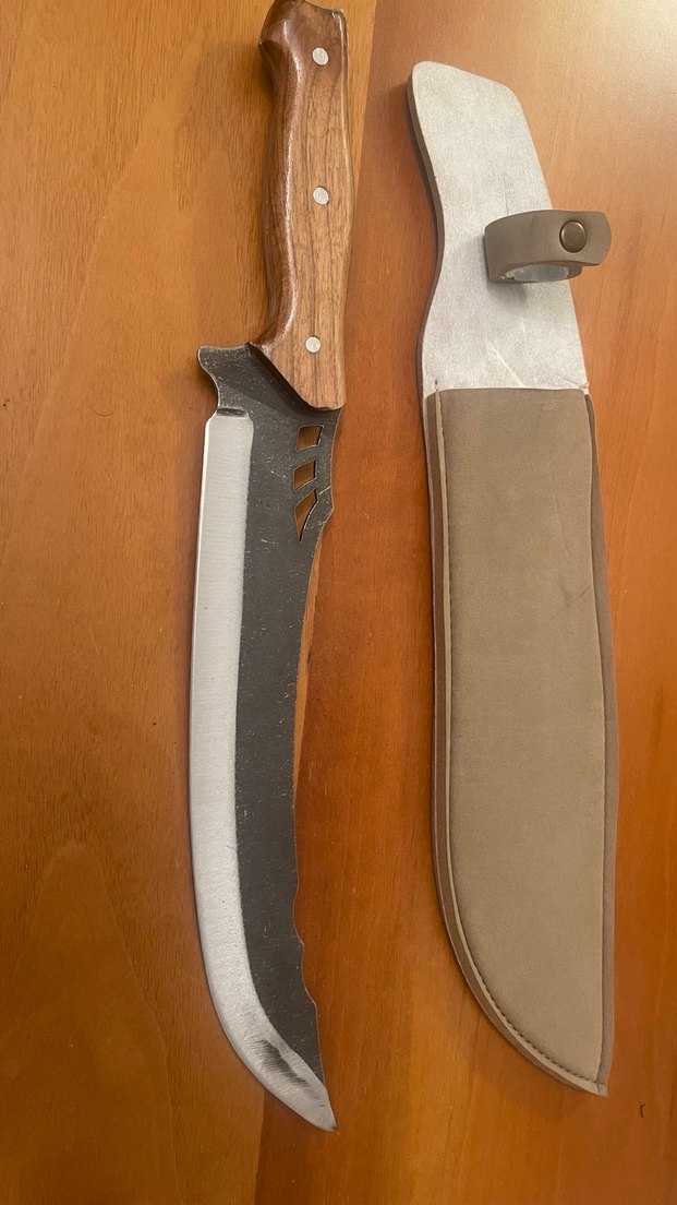 Ahşap saplı, keskin gri bıçağa sahip ve koruyucu bej kılıfı bulunan bıçak.