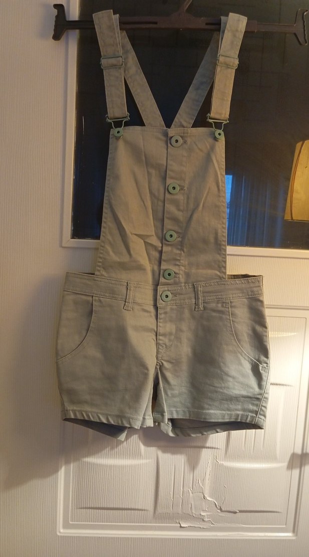 Su yeşili renkte, askılı ve tokalı kısa kot tulum. Straplez yakalı, düğmeli ön detaylı, rahat kesim sokak stiline uygun.