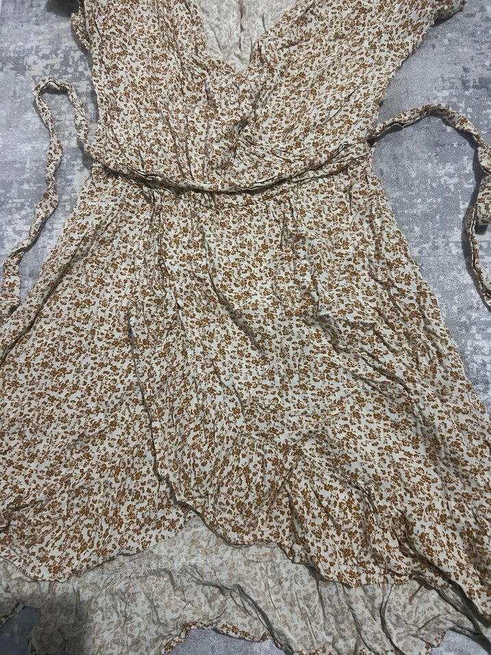 Bu kısa bej bohem elbise, bol kesimi, drapeli detayları ile dikkat çekiyor. V yaka ve yumuşak sentetik kumaştan üretilmiştir, günlük kullanım için uygundur.