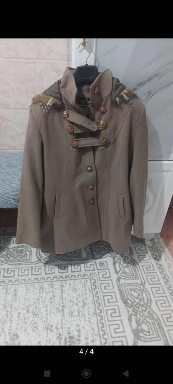 Bej renkte, kısa kesim, düğmeli kadın kaban. Notched lapel yakalı, uzun kollu ve rahat kesim. Yumuşak sentetik kumaştan, günlük kullanıma uygun.