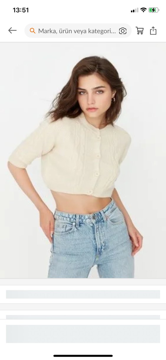 Bej renkli kısa düğmeli kadın kazak, yuvarlak yaka ve kısa kolludur. Yumuşak denim kumaştan üretilmiş, bol kesim rahat bir üründür.