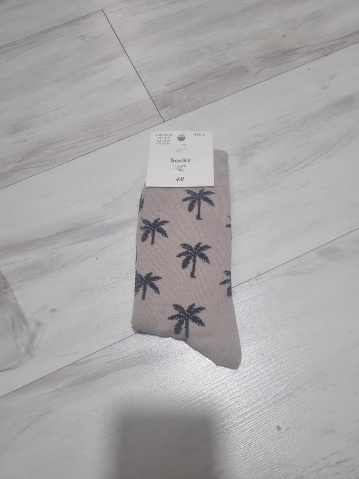 Bej renkli, siyah palmiye desenli, kısa boylu ve vücuda oturan erkek çoraplarıdır. hm marka 40 42 numara