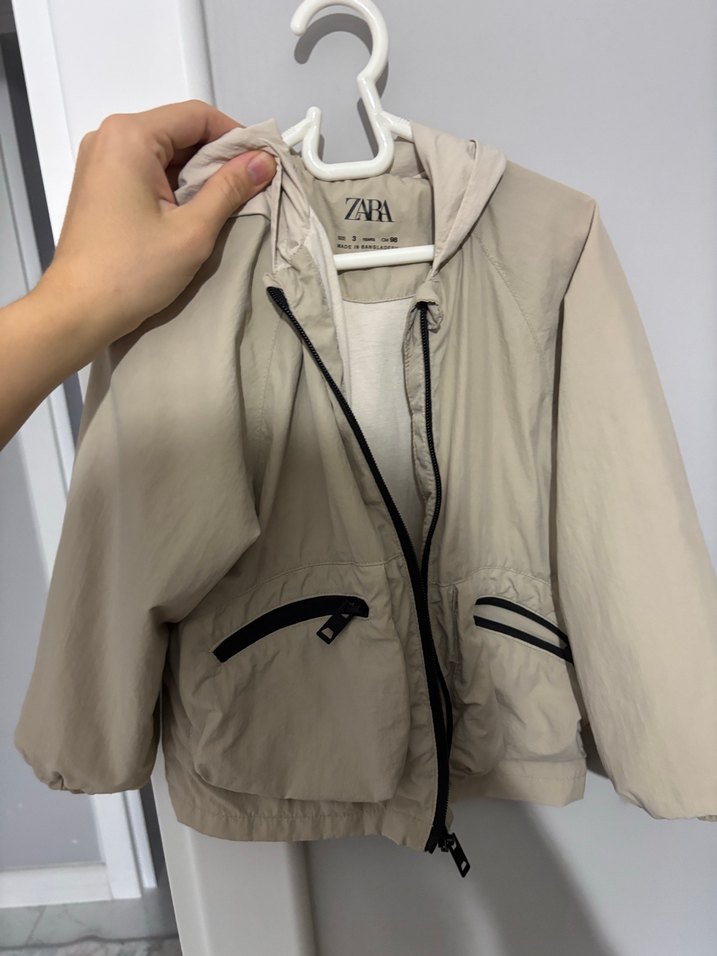 Bej renkli, uzun kollu, yuvarlak yakalı, fermuarlı ve cep fermuar detaylı bol kesim kadın ceket. Yumuşak sentetik kumaştan, ZARA markası.