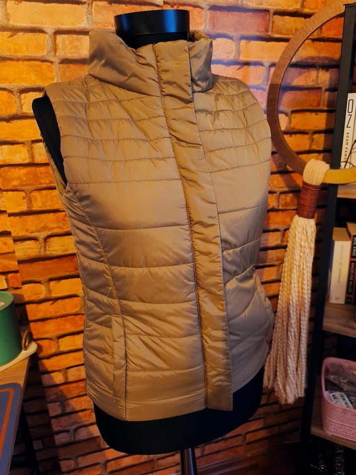 Yüksek yakalı, fermuarlı bej yelek, yumuşak sentetik kumaştan, kısa ve vücuda oturan kesimde, günlük şık stil için uygun.