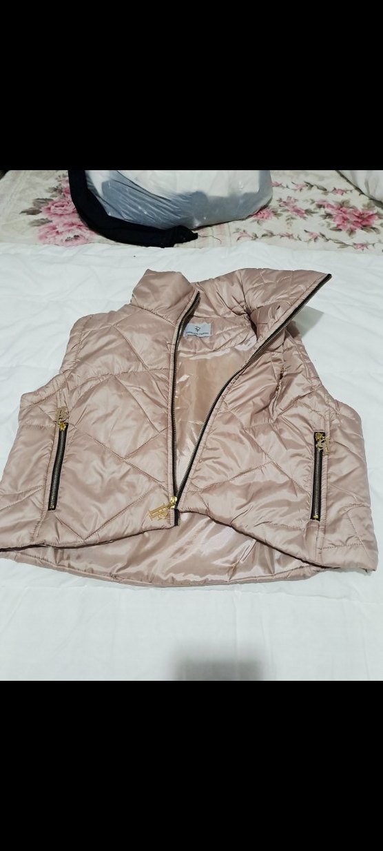 Bej renkli, fermuarlı cepleri ve yüksek yakası olan kolsuz kısa yelek. Yumuşak sentetik kumaştan, rahat ve şık bir sokak giyimi parçası olarak tasarlandı.95% polyester 5% elestan